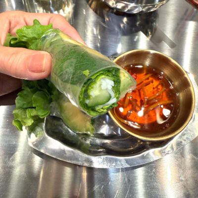 合間に野菜たっぷりのフレッシュな生春巻きもいただきました。ピーナツ入りのタレもおいしくて3口で完食。