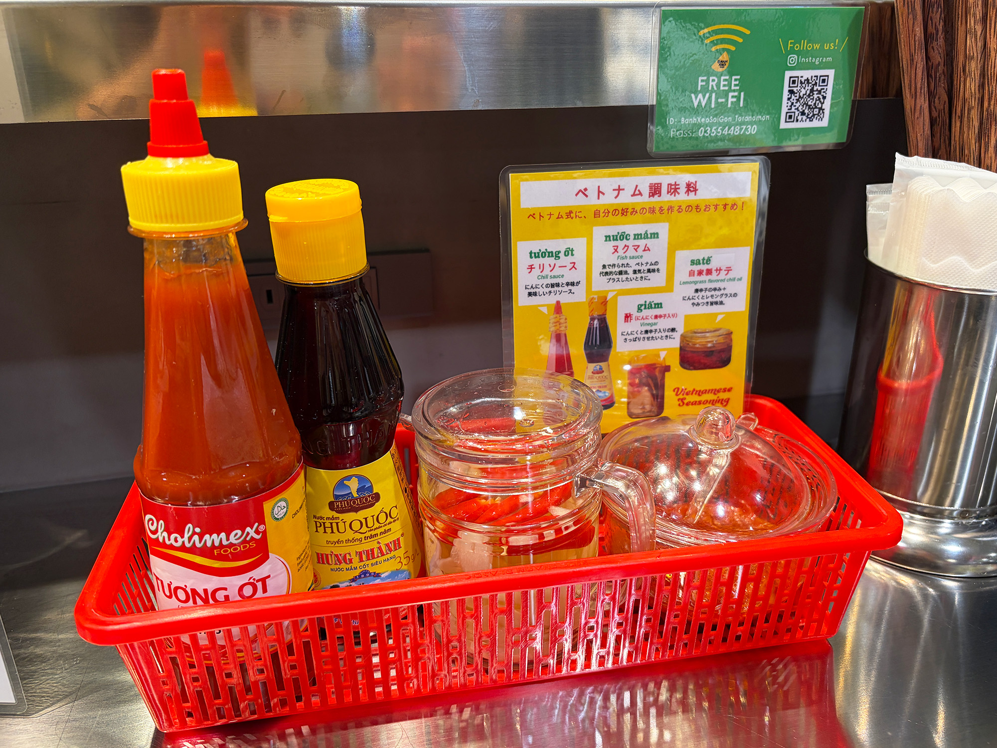 カウンターで待つ間に、目の前のかわいい赤いカゴに入っているベトナム調味料を予習。