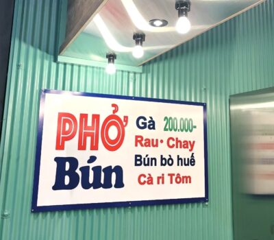 ハノイの街並みをイメージしたペールグリーンのトタン屋根風の装飾。食欲をそそる食堂の看板。もうここはベトナムだ〜♪
