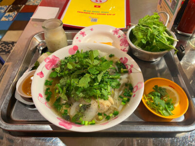 まもなく運ばれてきたフォーセット。野菜もりもりでヘルシー、隠れてしまったけれど生春巻きも付いているし、ベトナムデザートまでも。盛りだくさんです!
