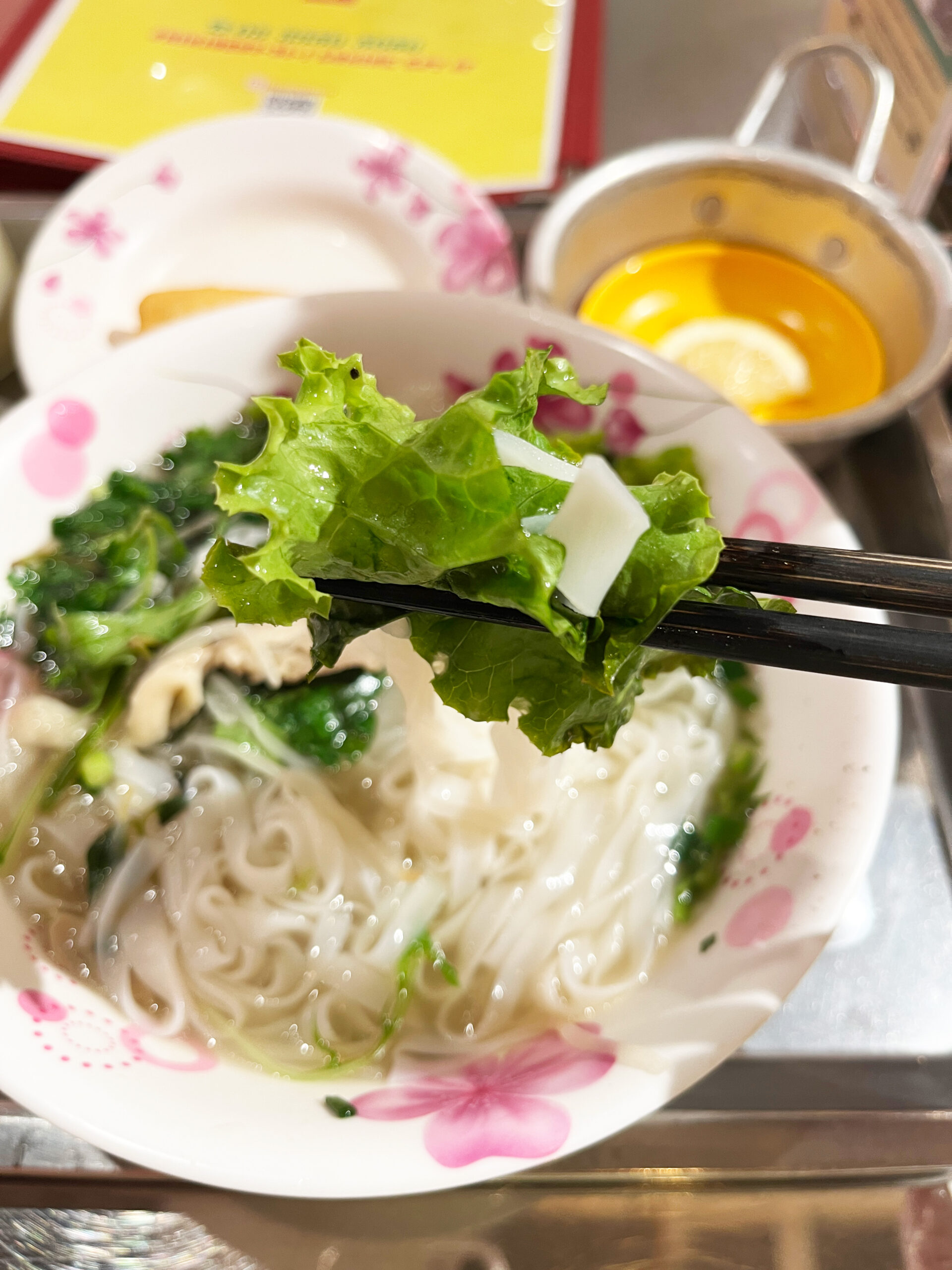 付け合わせの野菜をフォーの中に一気に入れて、麺と一緒にいただきます。
