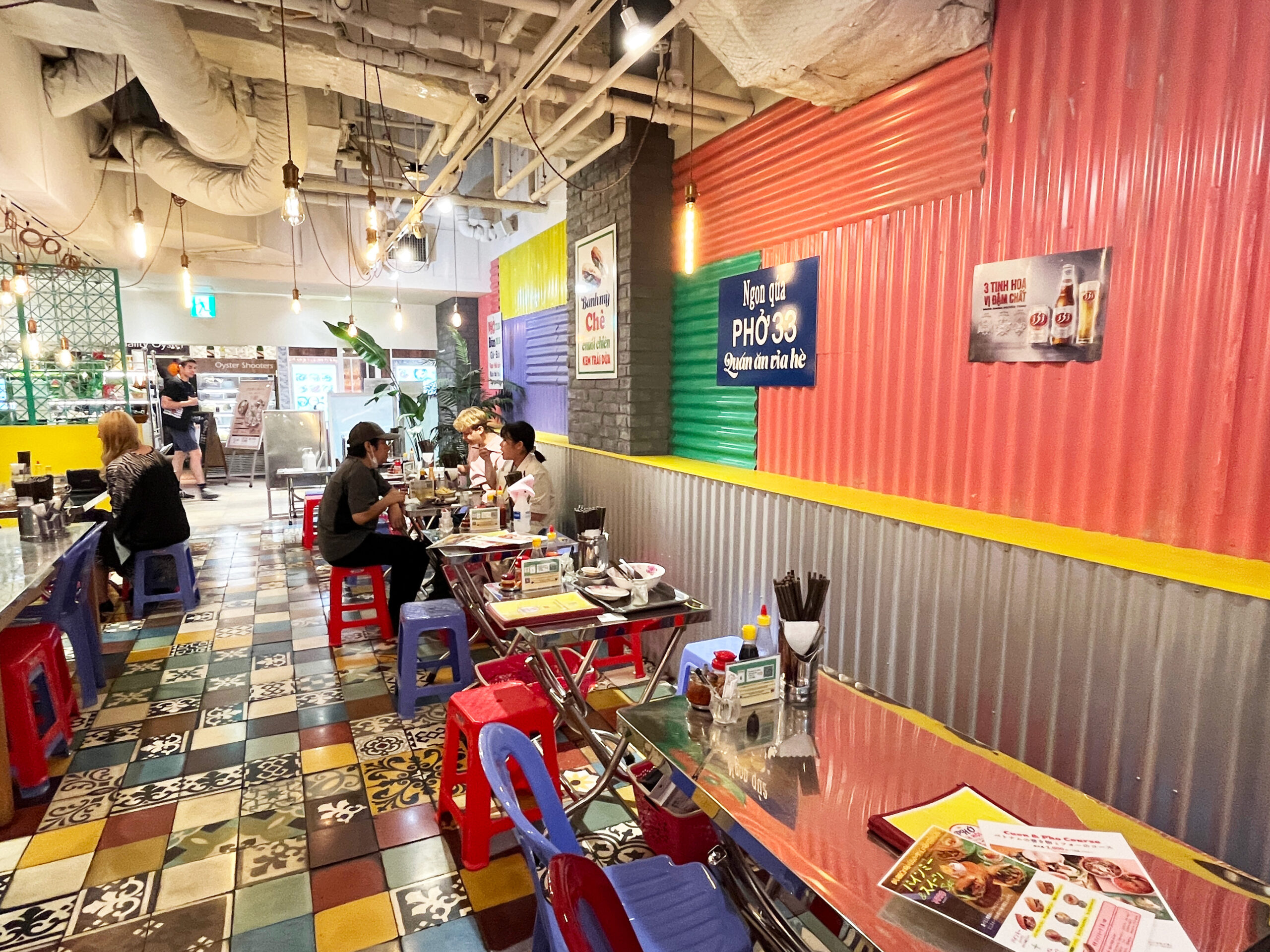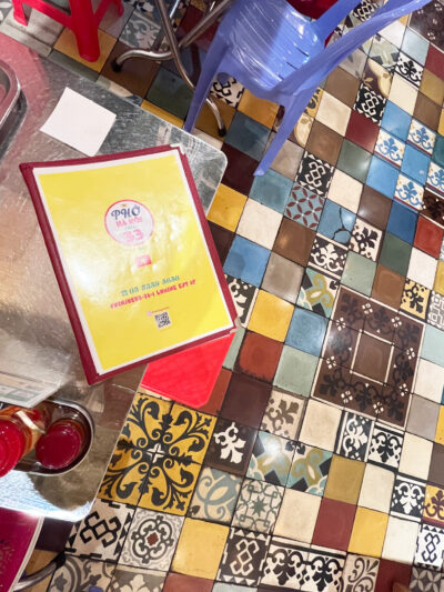 床は一面ベトナムのセメントタイルです。組み合わせはバラバラでも、全体に統一感があって、色合いも結構シック。こういうお店が現地ベトナムにあったなぁ、と記憶がよみがえってきます。