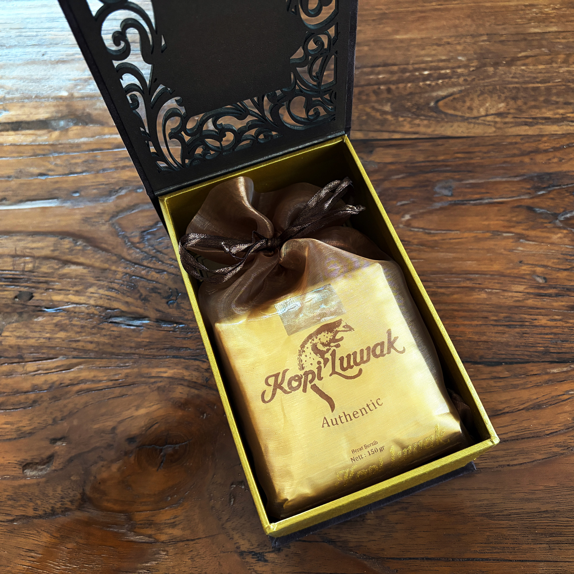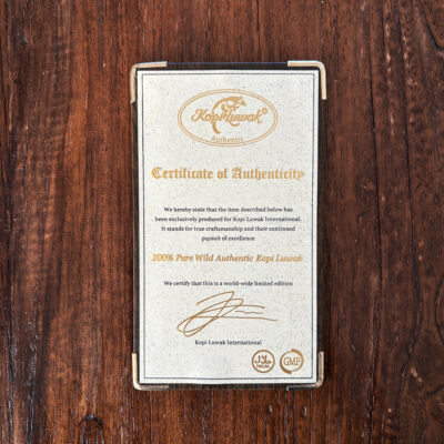 この箱は鑑定書付き。「100%天然で野生のコピ・ルアック」と書いてありました。