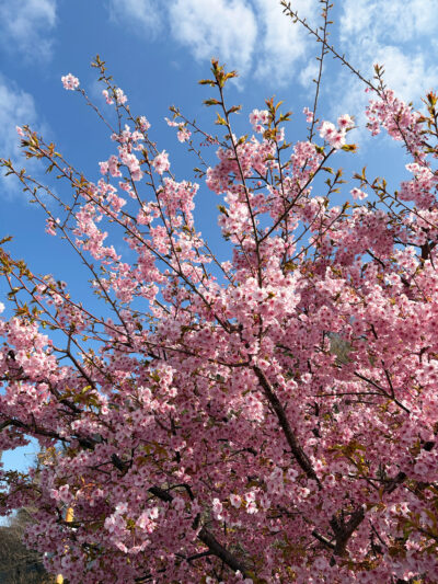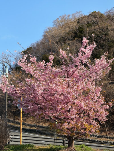 道中で早咲きの河津桜を見かけました。
