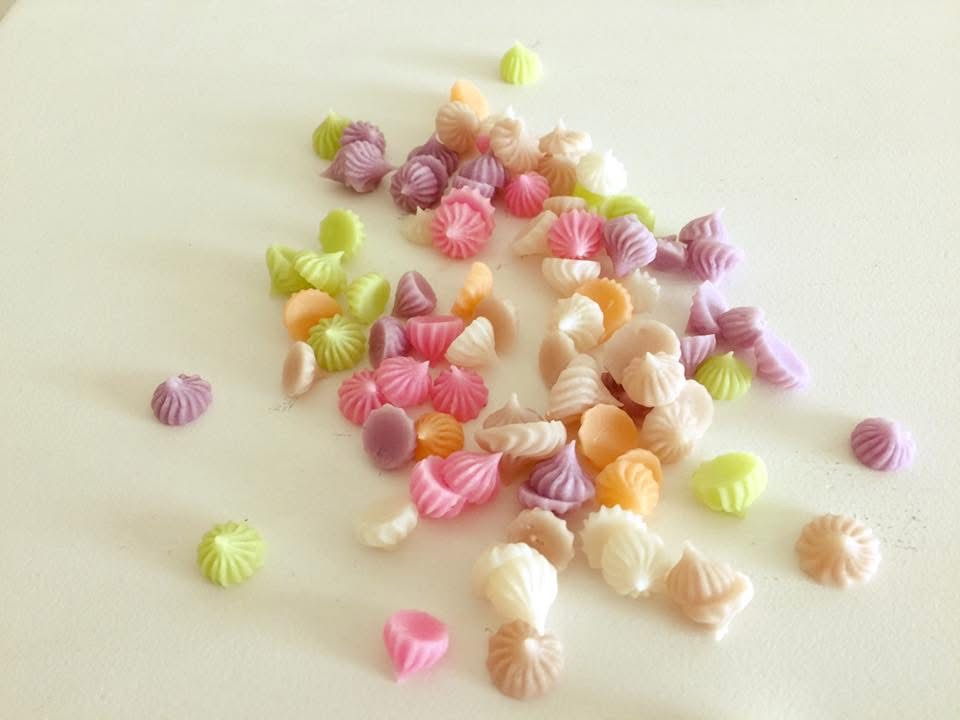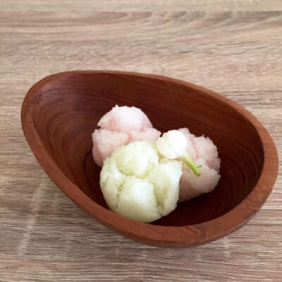 小麦粉、砂糖、ココナツミルク、卵黄を混ぜて煮詰めたものを、お花の型に入れてソフトに固めたお菓子です。