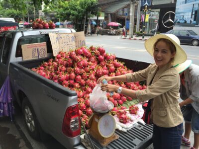 旬の5〜8月ごろには、トラックいっぱいにドラゴンフルーツを詰んだ農家さんの直売を街中でよく見かけました(写真はタイですが、ベトナムも同じ感じでトラック販売あり)。