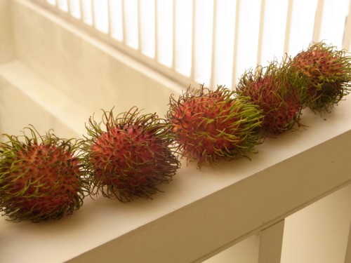 ある日、わん吉もランブータンを並べてみました。ベトナムの皆さんの独創的なセンスにはまったくかないませんが…