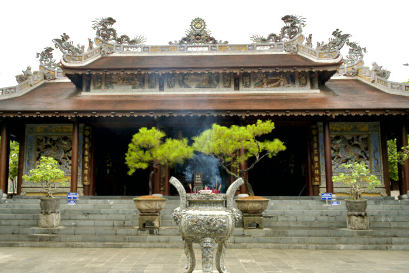 慈孝寺の本堂です。フエの中で古いお寺のひとつで、歴史を感じられます。建物の老朽化のために修繕されましたが、古き良き佇まいを残して、昔からの風格はかわらないです。