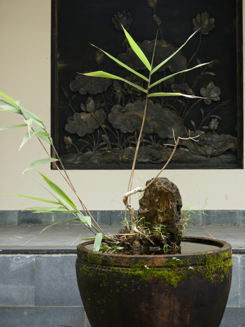 ベトナムオリジナルの盆栽で、水を張った鉢に岩を置き植物やミニチュアをのせて景色を楽しむものです。慈孝寺のホンノンボは、シンプルで奥深く自然のリズムに人の手がそっと加わった美しさがあると思います。