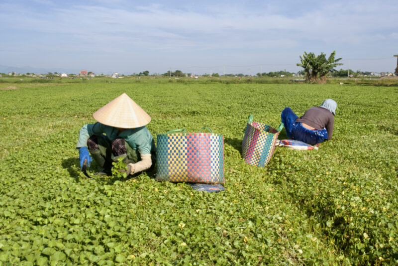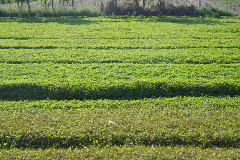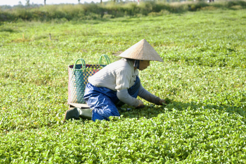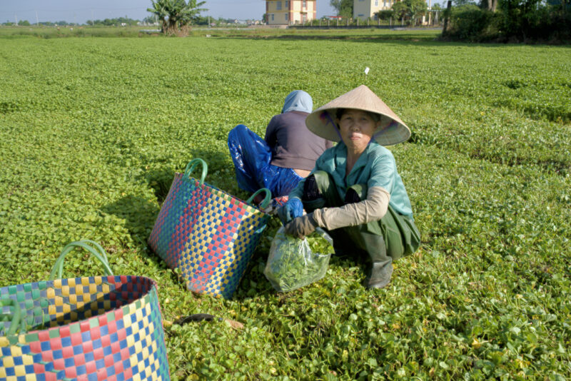 田んぼと蓮沼の道路を挟んだ向かいに、ツボクサ畑がずーっと広がっています。ここQuảng Điền(クアンディン)郡では、無農薬栽培のツボクサは有名です。