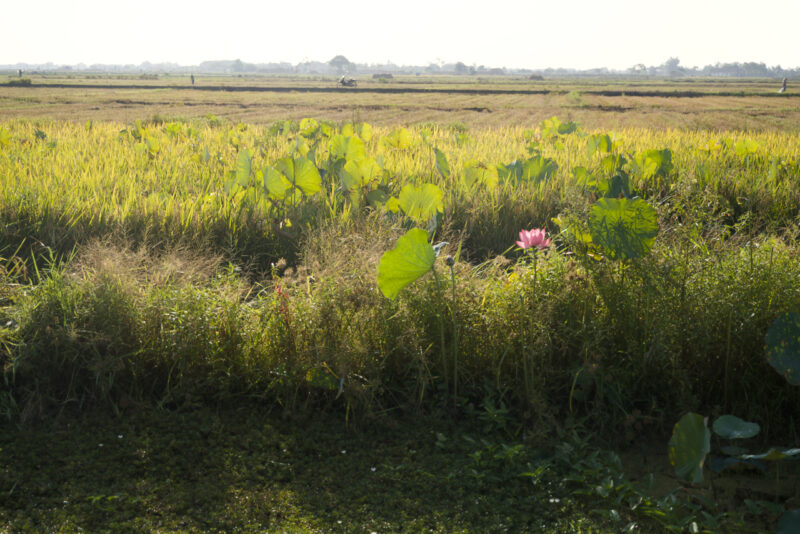黄金色の稲と蓮の葉が、朝の太陽に照らされて美しかったです。